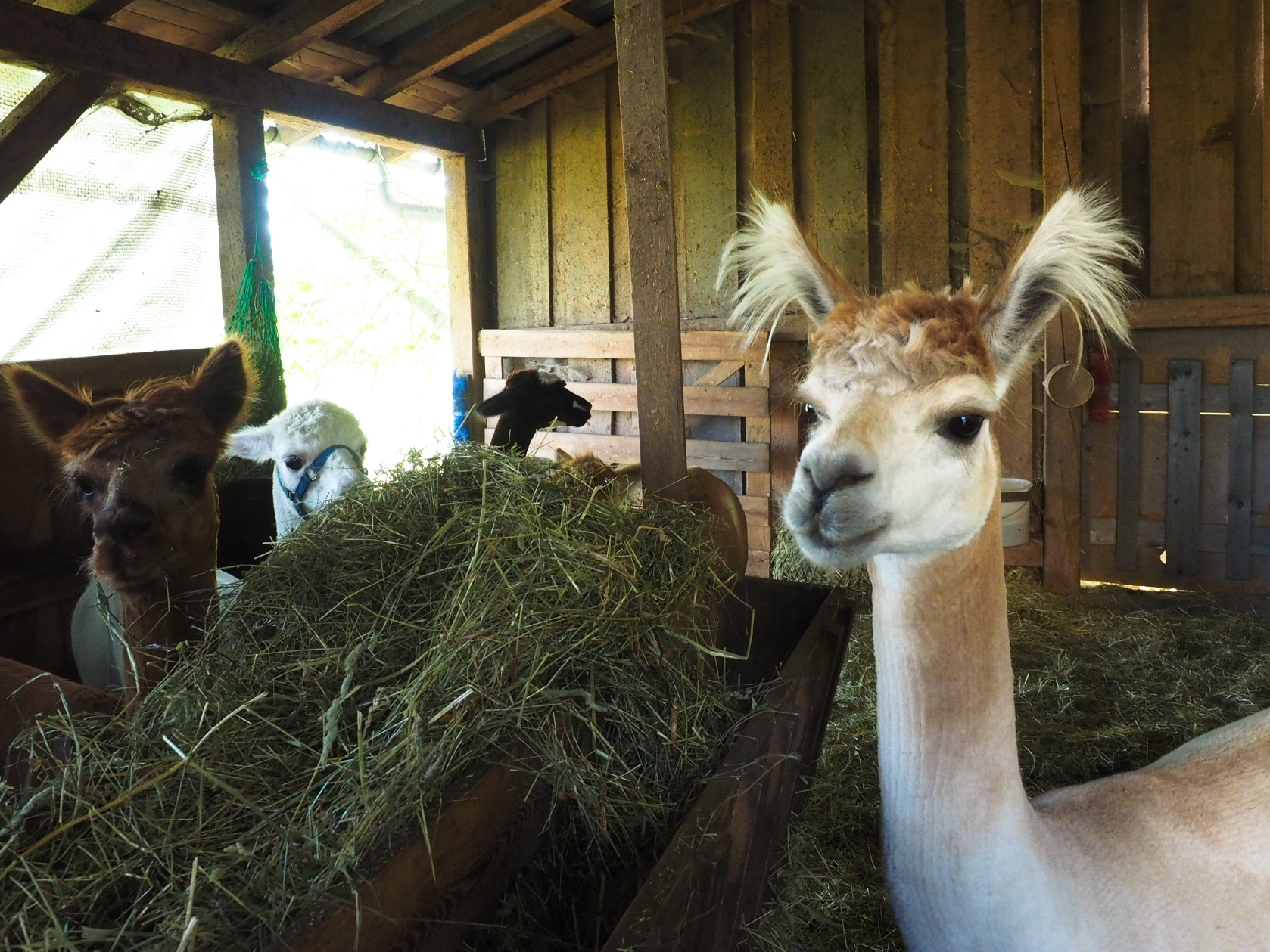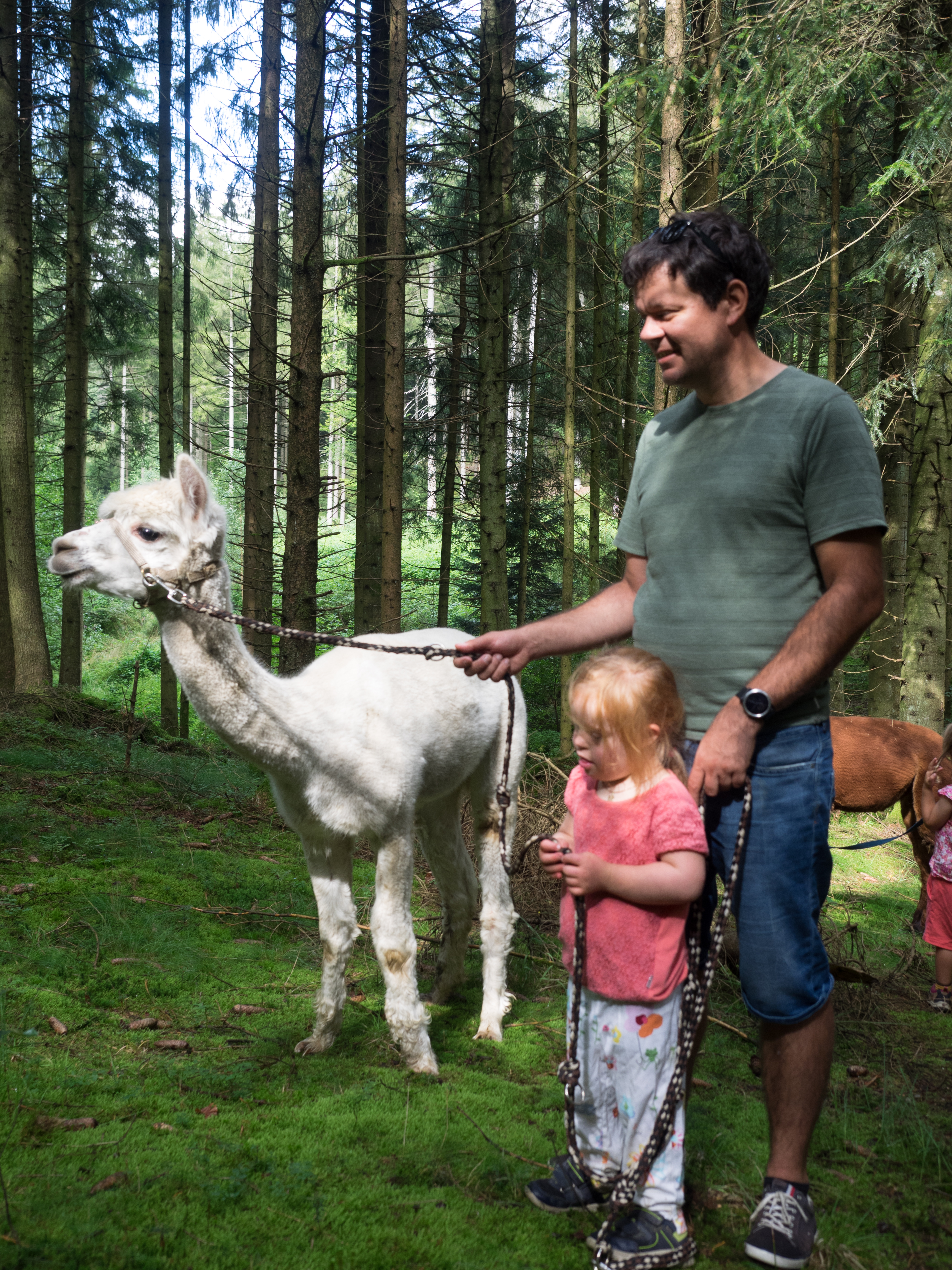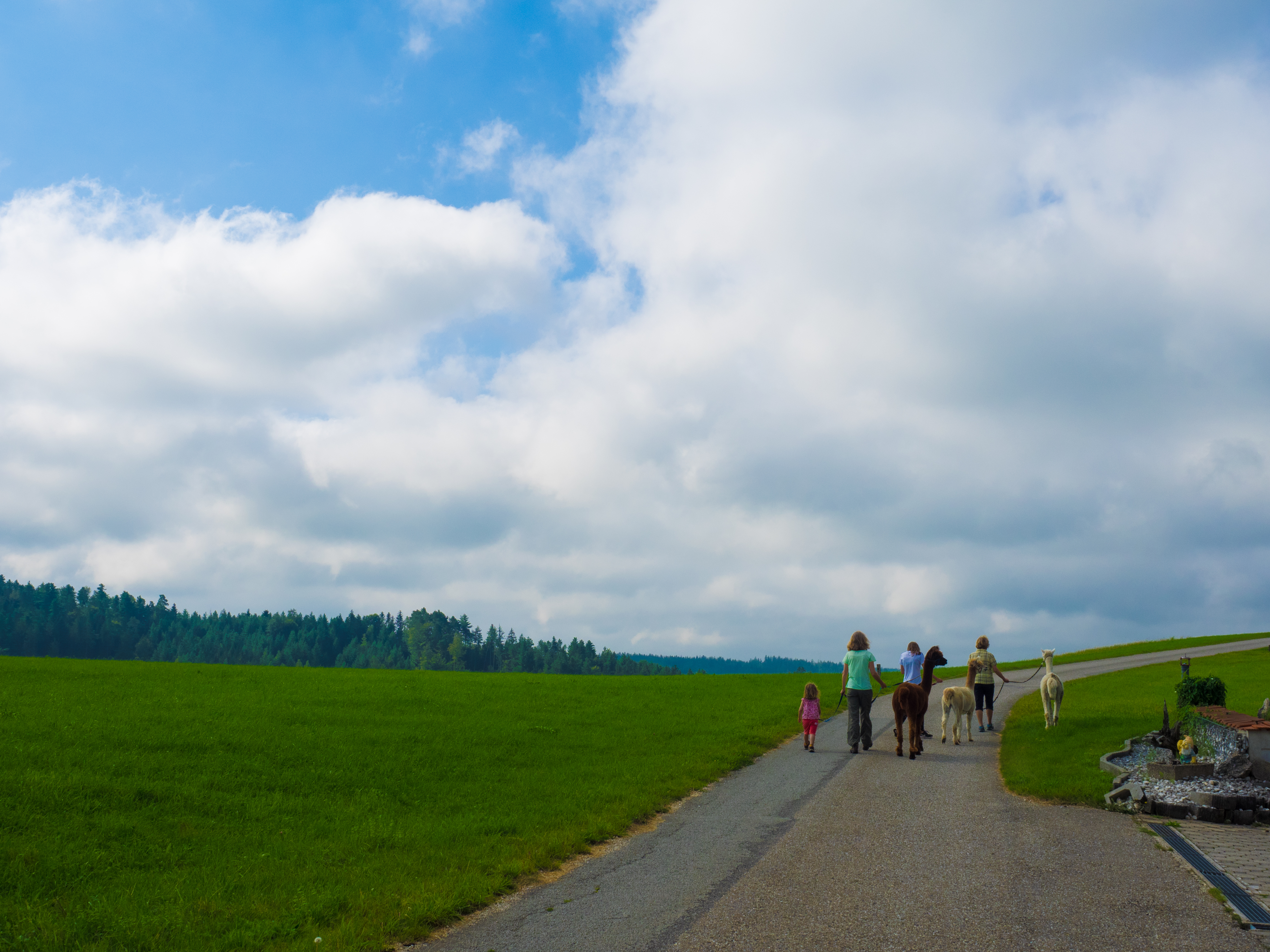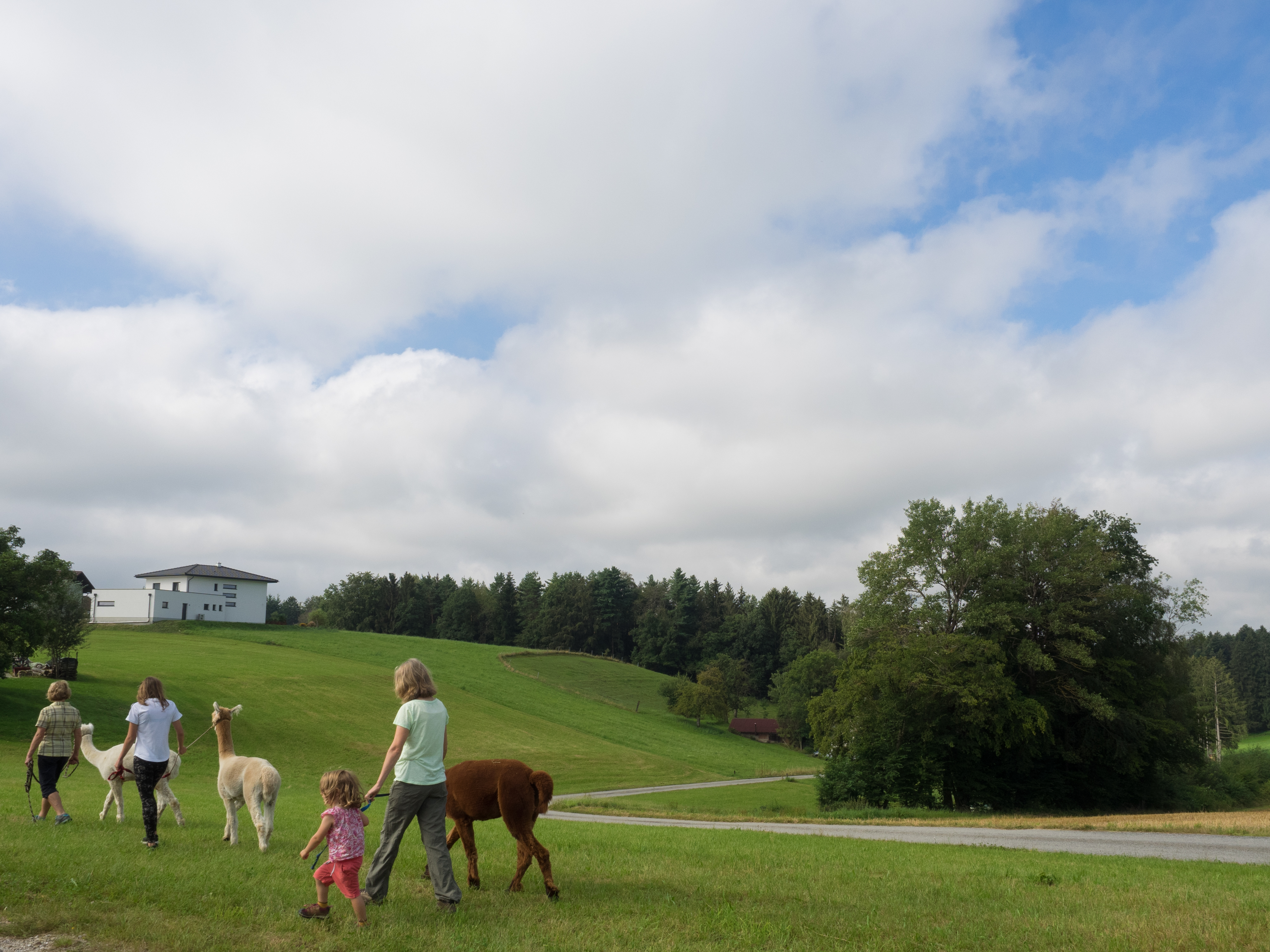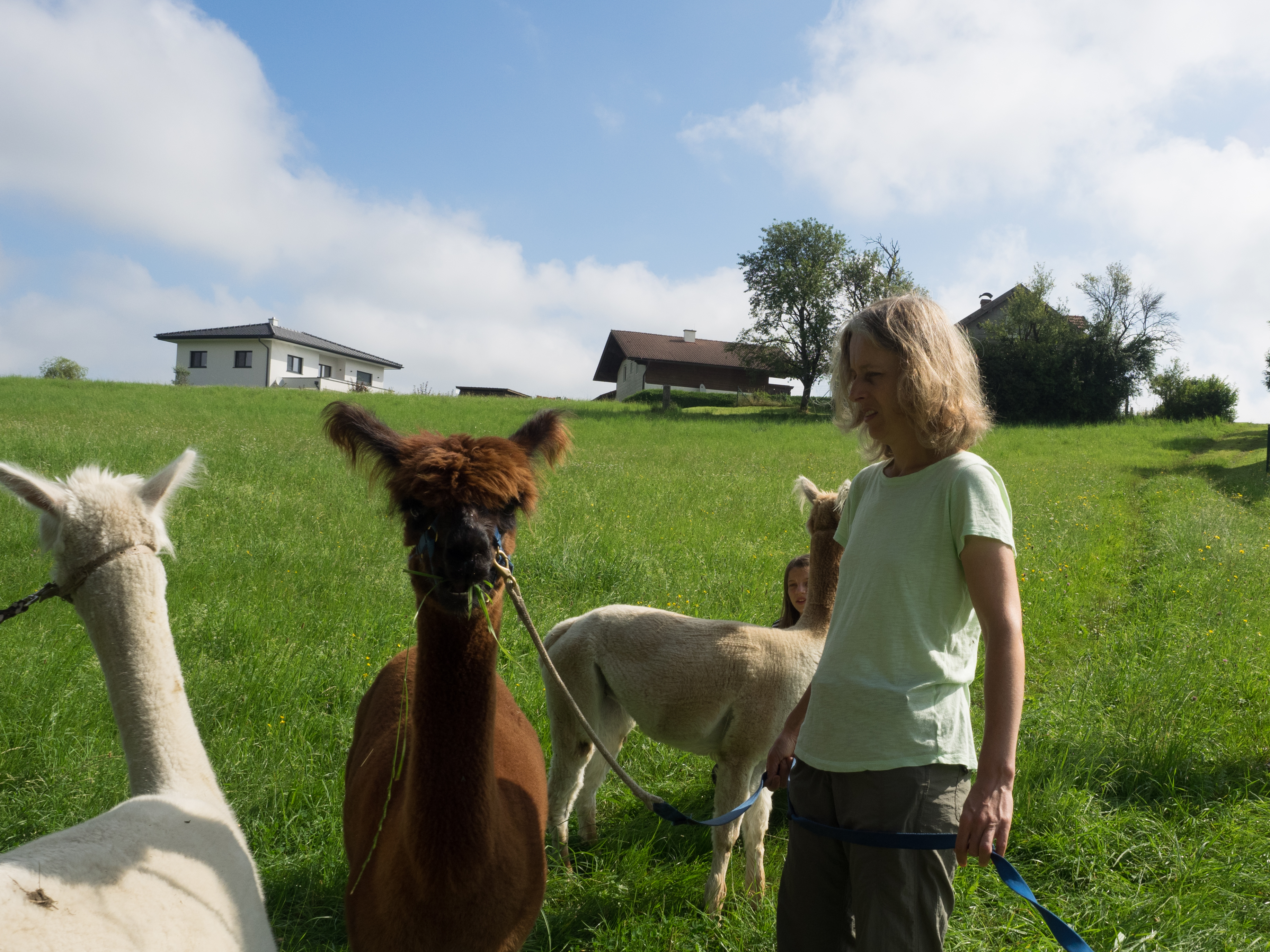 Alpakas stammen aus den Anden. Im Gegensatz zu ihren Verwandten, den Lamas, werden sie vor allem der Wolle wegen gezüchtet. Aber auch sie lassen sich gerne auf eine Wanderung ein. Dabei sind die Alpakas aber gerne zusammen: nervös werden die Tiere, wenn sie von ihren Artgenossen getrennt werden. Das Alpaka ist ein Herdentier. Deshalb ist bei der Wanderung auch auf ein gemeinsames Tempo zu achten. Dann marschieren die Tiere friedlich mit den Menschen mit, die sich am entspannten Gehen mit Tier erfreuen können. Gerlinde, meine Schwägerin, erklärt beim Wandern einiges über die Alpakas, über ihre Pflege und was sie so machen. Unsere Kinder waren begeistert und auch die vielen Gruppen, die während unseres Aufenthalts eine Alpaka-Wanderung machten, waren alle sichtlich zufrieden.